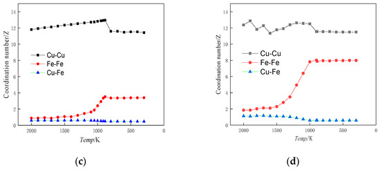 The coordination number (CN) indicates how many molecules are found in the range of each coordination sphere. Integrating g(r) in spherical coordinates to the first minimum of the RDF will give the coordination number of a molecule. The coordination number is a parameter that provides insight into the local atomic bonding within alloys. It is indicative of the short-range ordering of atomic arrangements and describes the proximity or closeness of atoms to a central atom. The coordination number is a statistical method for exploring the arrangement pattern of atoms’ nearest neighbours, and an increase in the coordination number indicates an increase in the local packing density of atoms [34,35]. Figure 4 shows the variation of atomic coordination number with temperature under simulated conditions.
