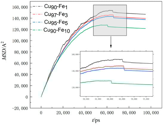 The observed decrease in the slope of the MSD (Mean Square Displacement) versus the time curve as time progressed suggests that the diffusion rate of Fe atoms within the system decreased over time [40]. This phenomenon can be attributed to the diminishing temperature of the system as time elapses. The significant subcooling effect caused a reduction in the thermal mobility of the atoms, leading to a decrease in the range of atomic movement. Additionally, from the visual observations, it became apparent that at any given moment, a higher Fe content within the alloy corresponded to a smaller mean square displacement and a reduced slope in the MSD vs. time curve. This further signifies that the diffusion rate of Fe atoms decreased as Fe content increased, and the range of atomic movement became more limited. At 55,000 ps–60,000 ps, the slope of the curve was close to 0, indicating that the diffusion rate of Fe atoms at this stage gradually decreased to 0. However, when analysed in context, non-diffusive local atomic structural rearrangements dominated the structural changes within the system during this period, making this phase an important stage in the formation of large Fe clusters. Here, non-diffusive atomic structure rearrangement refers to the fact that although an atom moves, it is in the bondage of the surrounding atoms; that is, the local structure of the atom and its surroundings is not changed. The aggregation and condensation of small clusters is a specific manifestation of this. At the times of 65,822 ps, 65,762 ps, 65,936 ps, and 60,682 ps, respectively, the curve appeared to be broken, at which time crystallisation took place, followed by minimal changes in the trace, which was mainly due to the low temperature of the system, with the cooling rate being too fast, resulting in a small range of atomic motion.