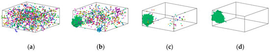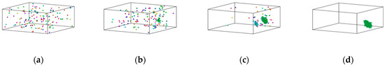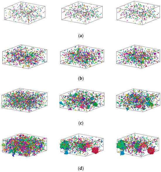 In order to facilitate the investigation into the formation of clusters, the analysis focused on the growth process at a temperature of 300 K when the largest clusters were present, as depicted in Figure 8 and Figure 9. The square in Figure 8 and Figure 9 represents the simulation box with dimensions of 108.42 × 108.42 × 43.368 Å3.
