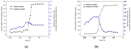 Cu99Fe1 alloy did not show the Fe atom aggregation phenomenon with decreasing temperature, and Fe atoms consistently maintained a uniformly dispersed state. Different from the distribution state of Fe atoms in the Cu99Fe1 alloy, the Fe atom aggregation phenomenon was found in the Cu97Fe3 alloy with a decrease in temperature, but the Fe clusters in the Cu97Fe3 alloy were found to be unstable after observation using visualisation software. Here, the maximum number of atoms contained in the clusters was not more than 5. Combined with the phase diagram analysis of Cu-Fe alloys, an observation can be made that when the Fe content of Cu-Fe alloys was lower than 3%, the Fe atoms mainly existed in the form of a Cu-based solid solution, which is consistent with the previous analysis and the results from prior research. When the temperature of Cu95Fe5 and Cu90Fe10 alloys was 2000 K, the Fe atoms were uniformly distributed in the system and did not show any structural non-uniformity. With the temperature reduction, the Fe atoms tended to aggregate with one another. Particularly within the temperature interval around 2000 K, which corresponded to the phase transition temperature, a gradual process occurred where Fe atoms transitioned from being dispersed as single atoms to forming small clusters. These small clusters subsequently grew in size, leading to the development of larger clusters with a non-uniform distribution. At the phase transition temperature in K, there was a temperature interval where the size of Fe clusters remained relatively stable, indicating a relatively stable system structure. To facilitate the study of cluster formation and growth, the analysis focused on Cu95Fe5 and Cu90Fe10 alloys at a temperature of 300 K when the largest clusters were present. The analysis considered the number of atoms within the largest clusters at different moments, including clusters with more than 5 atoms. This data were used to create a graph that depicts the total number of clusters and their sizes as a function of temperature change. Notably, the term “clusters” here refers to groups of atoms, and the largest cluster consistently remained within the temperature range from the phase transition temperature to 300 K, as illustrated in Figure 7.