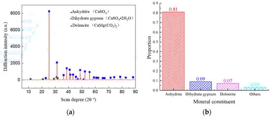 Figure 1. Mineral composition of anhydrite rock: (a) X-ray diffraction pattern and (b) proportion of mineral mass.