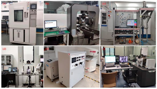 Figure 2. Main instruments: (a) high- and low-temperature alternating damp heat test chamber, (b) WDAJ-600 microcomputer-controlled electro-hydraulic servo rock shear rheological test machine, (c) ROCK600-50HTPLUS multifunctional rock full stress triaxial test system, (d) AG-250kN IS precision electronic universal material test machine (e) non-destructive NMR system for rock core imaging and analysis, and (f) field emission transmission electron microscope.