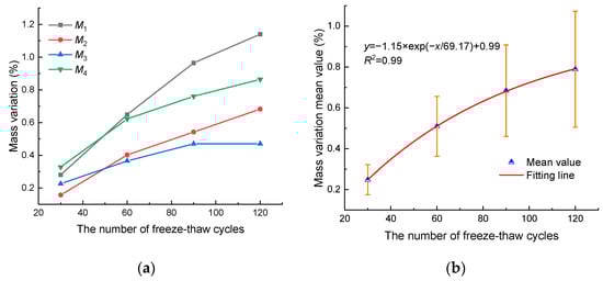 The mass variation is an important parameter for evaluating freeze–thaw damage. The freeze–thawed mass variation of four samples calculated by Equation (1) is shown in Figure 3. It can be seen from Figure 3a that the mass variation increases with the number of freeze–thaw cycles, indicating that the samples’ mass has reduced. After 30 freeze–thaw cycles, the mass variation of M1, M2, M3, and M4 are 0.28%, 0.16%, 0.23%, and 0.33%, respectively. After 120 freeze–thaw cycles, the mass variation of M1, M2, M3, and M4 are 1.14%, 0.68%, 0.47%, and 0.86%, respectively. During the freeze–thaw tests, white powdery or flaky rock solutes can be observed in water. Therefore, we can infer that the decrease in mass of anhydrite rock under freeze–thaw cycles is mainly due to the dissolution and peeling of rock minerals in water. Meanwhile, from Figure 3b, it can be seen that the mass variation mean value exponential grows with the number of freeze–thaw cycles.