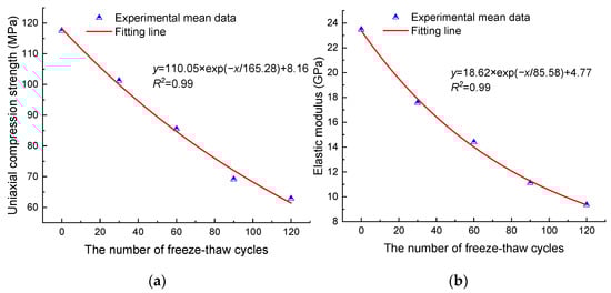 The results of the uniaxial compression tests of anhydrite rock are shown in Table 1. The evolution of uniaxial compression strength (UCS) and elastic modulus of anhydrite rock with the number of freeze–thaw cycles are shown in Figure 4. It can be seen that as the number of freeze–thaw cycles increases, the UCS and elastic modulus of anhydrite rock decrease exponentially. After 30, 60, 90, and 120 cycles, the mean UCSs decrease by 13.88%, 27.23%, 41.18%, and 46.54%, respectively, and the mean elastic moduli decrease by 25.14%, 38.65%, 52.66%, and 60.16%, respectively.