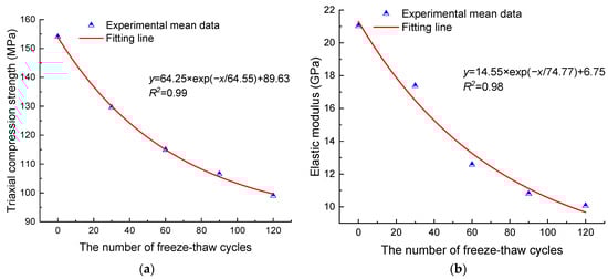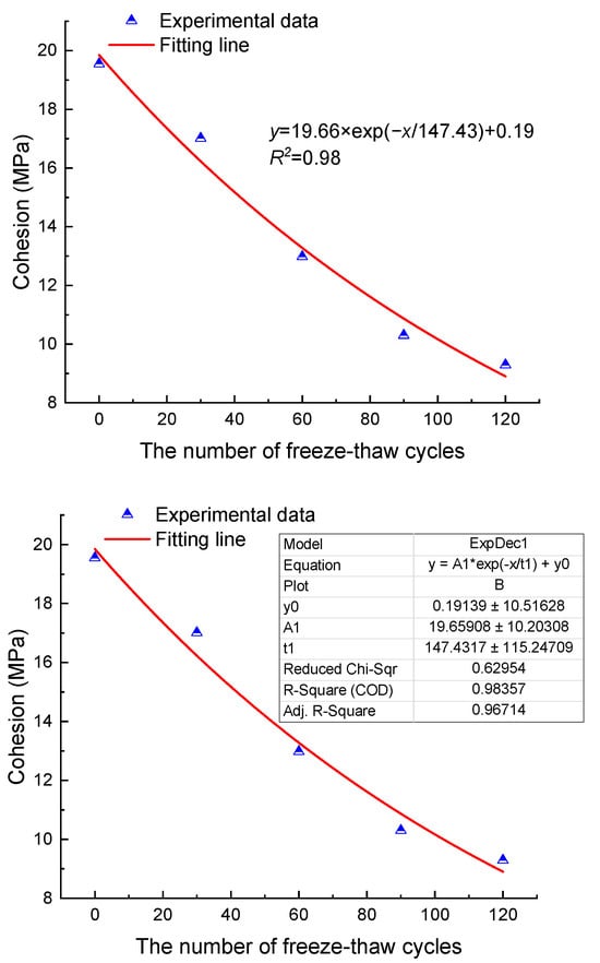 Based on the uniaxial and triaxial compression results, the Mohr–Coulomb criterion was used to calculate anhydrite rock’s cohesion and internal friction angle under different freeze–thaw cycles, as shown in Table 4. It can be seen from Table 4 that the cohesion decreases with the freeze–thaw cycles. After 30, 60, 90, and 120 cycles, the cohesion decreases by 12.99%, 33.61%, 47.31%, and 52.48%, respectively. The internal friction angle has no noticeable change, and its evolution amplitude is within 4.04°. The internal frictions of granite [39] and sandstone [24] under freeze–thaw cycles also exhibit similar evolution patterns. The above phenomenon is because the internal friction angle mainly reflects the friction characteristics between loose granular rock and soil. However, anhydrite rock, granite, and sandstone are hard rocks, and the freeze–thaw treatment has little effect on their internal friction angle. Meanwhile, Figure 7 shows the variation in cohesion with the number of freeze–thaw cycles. It can be seen that as the number of freeze–thaw cycles increase, the cohesion decreases exponentially.