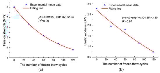 The test results of Brazilian splitting are shown in Table 5. Meanwhile, Figure 8 shows the evolution of the tension strength and elastic modulus of anhydrite rock with the number of freeze–thaw cycles. It can be seen that the tension strength and elastic modulus exhibit an exponentially decreasing relationship with the increase in freeze–thaw cycles. After 30, 60, 90, and 120 cycles, the mean tension strengths decrease by 21.3%, 35.49%, 45.33%, and 52.8%, respectively, and the mean tension elastic moduli decrease by 29.6%, 35.02%, 58.48%, and 73.65%, respectively.