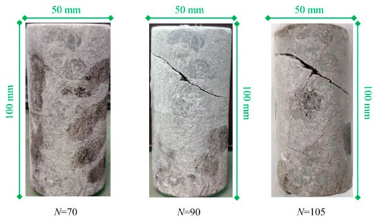 The damage phenomenon of a representative sample during the freeze–thaw treatment is shown in Figure 9. It can be seen from Figure 9 that when the number of freeze–thaw cycles was 70, two small-sized cracks appeared in the upper middle of the sample. When the number of cycles reached 90, the width of the cracks in the upper middle increased significantly, and some small-sized cracks also appeared in the lower part of the sample. As the number of cycles continued to grow, at 105 cycles, the macroscopic cracks in the upper and middle parts of the sample penetrated, causing a loss of load-bearing capacity, and the number of cracks in the lower part also significantly increased. It can be seen that the freeze–thaw cycles can cause irreversible damage to anhydrite rock. Thus, it is crucial to reveal the damage evolution process of freeze–thawed anhydrite rock from a macroscopic perspective.