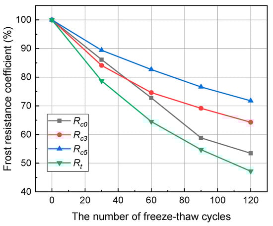 Figure 10 shows the variation in the frost resistance coefficient of anhydrite rock under different freeze–thaw cycles. Rc0, Rc3, Rc5, and Rt represent the frost resistance coefficient under uniaxial compression tests, triaxial compression tests ( σ 3 = 3   MPa ,   σ 3 = 5   MPa ), and Brazilian splitting tests, respectively. It can be seen that the frost resistance coefficient of anhydrite rock decreases with the increase in freeze–thaw cycles. After 120 cycles, Rc0, Rc3, Rc5, and Rt decrease from 100% to 53.47%, 64.28%, 71.76%, and 47.21%, respectively. Under the same freeze–thaw cycles, the frost resistance coefficient increases with the increase in confining pressure. The frost resistance coefficient of anhydrite rock under tension stress is the smallest, indicating that the freeze–thawed anhydrite rock is unstable under the tension conditions.