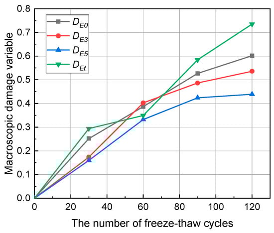 The relationship between the macroscopic damage variable of anhydrite rock and the number of freeze–thaw cycles is shown in Figure 11. DE0, DE3, DE5, and DEt represent macroscopic damage variables of anhydrite rock under uniaxial compression tests, triaxial compression tests ( σ 3 = 3   MPa ,   σ 3 = 5   MPa ), and Brazilian splitting tests, respectively. It can be seen that the macroscopic damage variables increase with the number of freeze–thaw cycles. After 120 cycles, DE0, DE3, DE5, and DEt increase to 0.60, 0.54, 0.44, and 0.73, respectively. Under the compression stress conditions, the macroscopic damage variable decreases with the confining pressure. For example, after 120 cycles, DE0 is 1.11 times higher than DE3 and 1.36 times higher than DE5. The reason for the above phenomenon is that confining pressure inhibits the development of freeze–thaw damage in anhydrite rocks. In addition, the tension damage variable is greater than the compression damage variable. For example, after 120 cycles, DEt is 1.22, 1.35, and 1.66 times higher than DE0, DE3, and DE5, respectively. It can be noted that the tension strength of rocks is much lower than the compression strength, and rocks are more prone to failure under tension stress. Thus, the damage development for rocks under tension conditions is faster, and the damage is more significant.