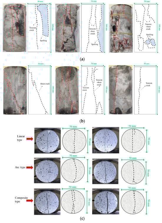 Figure 12. Cracking modes of anhydrite rock under different loading conditions: (a) uniaxial compression, (b) triaxial compression, and (c) Brazilian splitting.