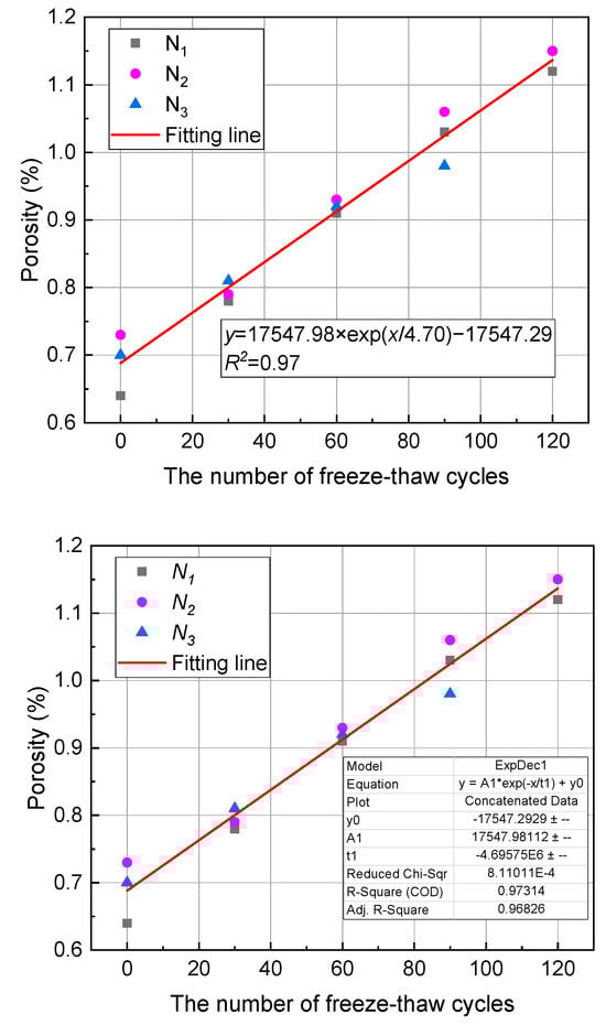 Porosity is one of the most important indicators for evaluating the physical and mechanical properties and pore structure characteristics of rocks. The changes in the porosity of anhydrite rock under freeze–thaw cycles detected by NMR tests are shown in Figure 13. It can be seen that the porosity of the N1, N2, and N3 samples increases exponentially with the number of freeze–thaw cycles and has a good correlation (R2 = 0.97). After 30, 60, 90, and 120 cycles, the porosity of the N1 sample increases by 21.88%, 42.19%, 60.94%, and 75%, respectively, and the porosity of the N2 sample increases by 8.22%, 27.4%, 41.1%, and 57.53%, respectively. It should be noted that due to the failure of the N3 sample during 90 to 120 cycles, further NMR testing cannot be conducted. Therefore, the data at 120 cycles of the N3 sample are not provided. After 30, 60, and 90 cycles, the porosity of the N3 sample increases by 15.71%, 31.43%, and 40%, respectively.