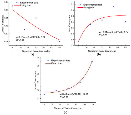 The pore volume and proportion can be directly reflected through the curve area in Figure 14, and the curve area evolution for different types of pores of the N1 sample is depicted in Figure 15. As shown in Figure 15, with the increase in freeze–thaw cycles, the curve area of micropores in anhydrite rock decreases exponentially. In contrast, the curve area of mesopores and macropores increases exponentially. The correlation coefficient of the fitting curve is greater than 0.72. After 120 cycles, the areas of the micropores decrease by 64.71%, while the areas of the mesopore and macropore increase by 71.28% and 117.32%, respectively. Based on this, it can be deduced that under the freeze–thaw environment, the micropores in anhydrite rock gradually transform into mesopores and macropores, causing a decrease in the volume of micropores and an increase in the volume of mesopores and macropores. In addition, the increase in macropores is much more significant than that of mesopores.