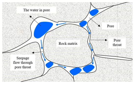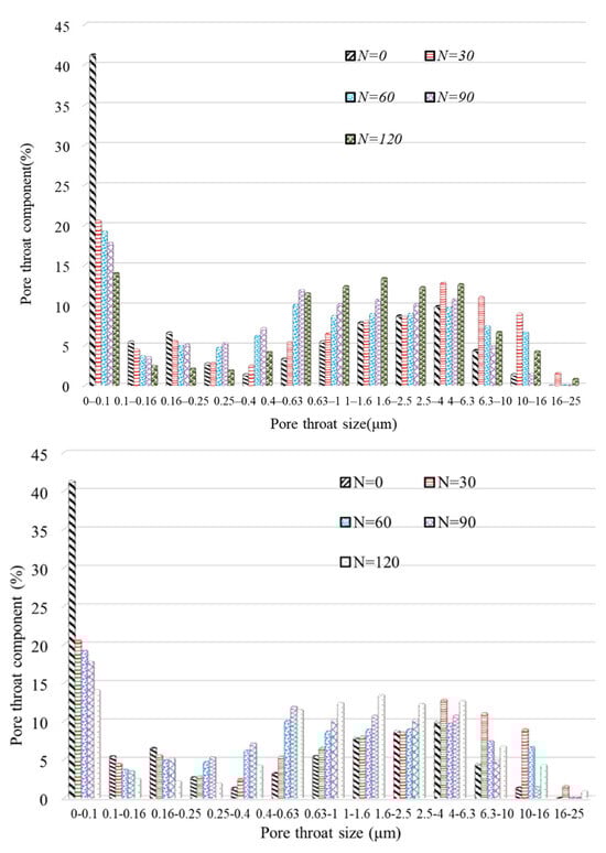 The pore structures of rocks include pores and pore throats, as shown in Figure 16. Pores can store fluid substances such as water, and the pore throats are the connecting channels between pores. The existence of pore throats provides a pathway for fluid migration within rocks. It is believed that the fewer the pore throats, the poorer the connectivity of the crack network and the higher the tortuosity. Thus, the distribution of pore throats has an essential impact on the permeability characteristics and porosity of rock. The evolution of pore throat distribution in anhydrite rock under freeze–thaw cycles is shown in Figure 17. It can be seen that under different freeze–thaw processes, the pore throat diameter distribution of anhydrite rock is within the range of 0–25 μm. The proportion of pore throats in 0–0.1 μm is the highest, and the proportion of pore throats in 16–25 μm is the smallest.