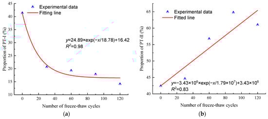 Similarly, the pore throats of anhydrite rock are divided into three types according to their size, namely: PT-I (0–0.1 μm), PT-II (0.1–4 μm), and PT-III (4–25 μm). Figure 18 shows the variation in the proportion of different types of pore throats of the N1 samples. It can be seen that there is an excellent exponentially decreasing trend between the PT-I pore throat proportion and the number of freeze–thaw cycles (R2 = 0.98). At the same time, there is a perfect exponentially increasing trend between the PT-II pore throat proportion and the number of freeze–thaw cycles (R2 = 0.83). After 120 cycles, the proportion of PT-I pore throats decreases by 65.89%, while the proportion of PT-II pore throats increases by 54.54%. The above phenomenon indicates that as the number of freeze–thaw cycles increases, the diameter of some PT-I pore throats gradually increases, transforming into PT-II pore throats. Due to the lack of a clear variation relationship between the PT-III pore throat and the number of freeze–thaw cycles, the PT-III pore throat is not plotted there.