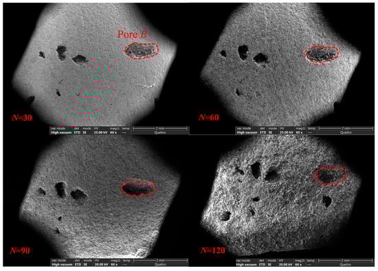 Figure 19 shows the SEM images of the morphological evolution of the anhydrite samples under a freeze–thaw action. It should be noted that it is challenging to achieve positioning observation during the freeze–thaw tests because the positioning observation marks easily fall off and disappear under the freeze–thaw environment. Interestingly, after 30 freeze–thaw cycles, many pores appear, and these pores are used to achieve positioning observation through SEM technology. Taking the S2 sample as an example, the relatively large pore B is used as the observation benchmark to achieve positioning observation. It can be seen from Figure 19 that the morphology of the S2 sample is significantly changed under freeze–thaw cycles. With the increase in freeze–thaw cycles, the pore area and roughness of the sample gradually increase. After 120 cycles, there is a significant honeycomb and pitted surface phenomenon.