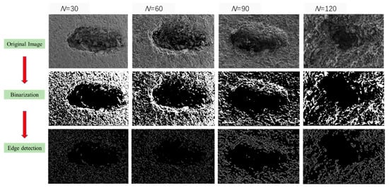 Image processing analysis methods are used to analyze the morphology evolution of anhydrite rock under the freeze–thaw environment further. The image processing processes are as follows: (1) Grayscale image conversion: Converting the original image into an unsigned 8-bit grayscale image with pixels between 0 (black) and 255 (white). (2) Image denoising: Using the median filtering method to denoise the image. Median filtering is the most commonly used filtering method, which is a neighborhood operation that arranges the grayscale values of the image from small to large and uses the median as the output value of pixels to achieve noise reduction in the image, and the filtered image has clear edges. (3) Image binarization: The filtered image is converted into a binary image with pixels of 0 (black)—1 (white). (4) Edge detection: The primary purpose of edge detection is to obtain the range boundaries of pores and cracks in the damaged area. In this paper, the Sobel operator is used for edge detection, and the Sobel operator has good detection results for grayscale images with high noise.