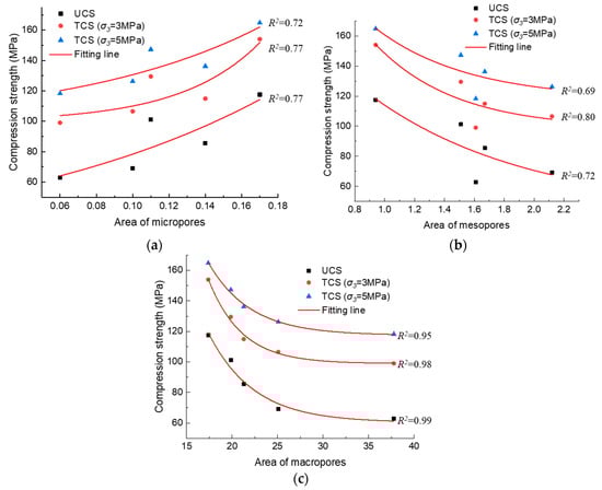 Figure 21. Relationship between pore area and compression strength: (a) area of micropores, (b) area of mesopores, and (c) area of macropores.