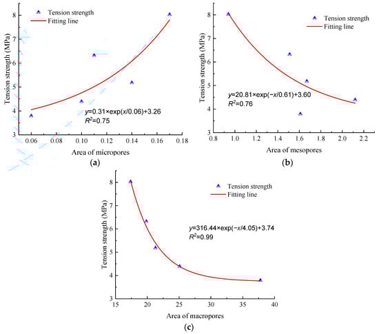 Figure 22. Relationship between pore area and tension strength: (a) area of micropores, (b) area of mesopores, and (c) area of macropores.