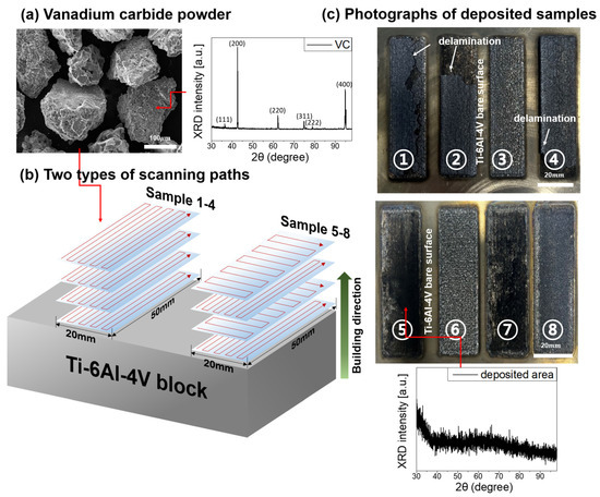 (a) Scanning electron microscopy (SEM) image of as-received VC powder. (b) Schematic depicting vanadium carbide (VC) powder scanning pass deposition on Ti–6Al–4V alloy. (c) Photos of deposited samples with insets of X-ray diffraction (XRD) patterns from as-received VC powder and deposited VC layer.