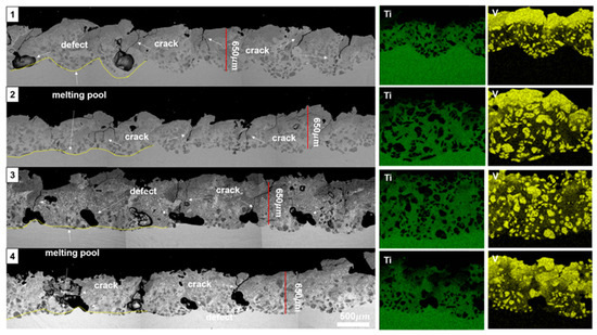 To gain a more comprehensive understanding, samples 1–4 were subjected to detailed analyses using scanning electron microscopy–energy dispersive X-ray spectroscopy (SEM–EDS), as illustrated in Figure 2. Across all conditions, the melting pool formed on the alloy substrate exhibited an average depth of 500 µm. Notably, in samples 1, 2, and 4, where delamination was observed in Figure 1, it was found that the layer of pure VC deposition, distinct from the VC-Ti mixed layer, was considerably thick. This observation suggests that the presence of a pure VC layer contributes to delamination, primarily due to the residual stresses arising from the significant disparity in CTE between these layers and the titanium base. Given the small sample size, this might result in a localized concentration of high heat input, especially at points where the laser scanning paths overlap, leading to issues like inadequate fusion.