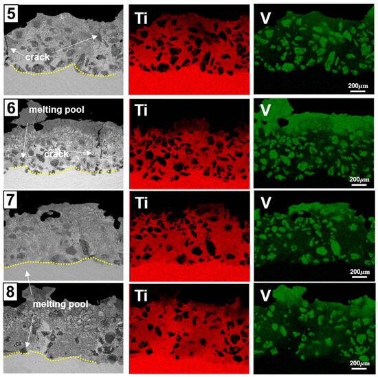 Contrasting with the issues faced in samples 1–4, samples 5–8 demonstrated enhanced interface quality and a reduced incidence of pitch-to-pitch defects. However, the complexity of the situation should not be overlooked. While samples 7 and 8 showed few surface cracks, samples 5 and 6 still exhibited cracking, particularly around areas of VC particle aggregation. This phenomenon was similar to what was observed in samples 1–4, despite the implementation of a zigzag scanning path and low-energy-density deposition conditions aimed at maintaining flatness between the Ti–6Al–4V substrate and the VC-deposited layer.