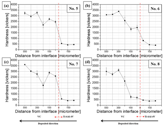 Vickers hardness results for samples (a) 5, (b) 6, (c) 7, and (d) 8. The red dotted lines indicate the interface between Ti–6Al–4V and VC.
