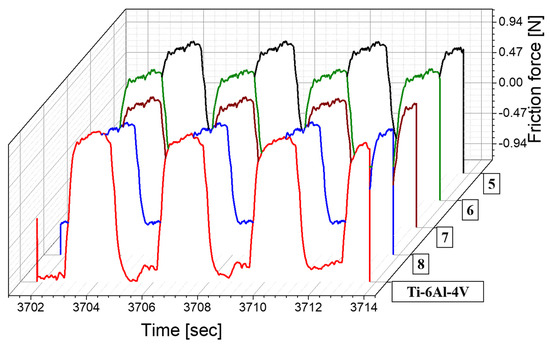 The study further delved into analyzing the wear and friction characteristics of the alloy. To ensure accurate results, the surfaces of the samples were polished with emery paper, achieving a smooth finish suitable for testing. Notably, the friction force exhibited by samples 5–8 was approximately ±0.8 N, which was lower compared to the ±1.1 N observed in the Ti–6Al–4V alloy, as depicted in Figure 5. This difference in friction forces is crucial, particularly considering its impact on the wear resistance of the surface in practical applications.
