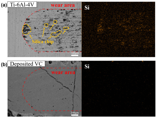 Samples 5, 7, and 8, showing no weight change after the pin-on-disk test, demonstrate that the VC-Ti mixed layer resulting from VC deposition markedly improves surface friction and wear characteristics. This enhancement has the potential to extend the lifespan and boost the performance of the material in a range of applications. However, these findings also highlight the intricate nature of the deposition process and the complex material properties that result from it. To gather deeper insights into the wear mechanism, an SEM analysis was conducted on the surfaces of the wear track following the pin-on-disk test, as presented in Figure 6. Analyzing the wear specimen is vital for understanding the wear behavior, and notable differences were observed between the bare Ti–6Al–4V alloy and the VC-deposited surface. Figure 6a depicts the worn surface of the Ti–6Al–4V alloy post-wear test, while Figure 6b shows the worn surface of sample 7, which exhibited the highest surface hardness. The Ti–6Al–4V alloy was subject to wear by a silica ball during the test, leading to adhesive wear due to differences in bond strength at the contact area between silica and the alloy. SEM–EDS mapping analysis also revealed tiny Si-containing chips on the worn Ti–6Al–4V surface, indicative of abrasive wear. In stark contrast, the VC-deposited surface showed no significant morphological changes due to the silica ball, underscoring its resistance to wear.