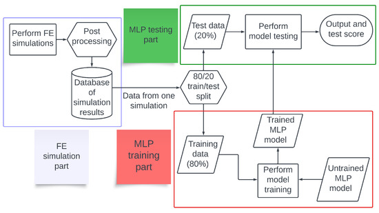 A flowchart of the work performed in this study. FE simulations were performed to generate data, and the postprocessed data were used to train and test MLP models.