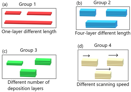 An illustration of the four groups of FE systems considered in this study. (a) illustrates the group with one-layer bars of different length, (b) the group with four-layer bars of different length, (c) the group with bars of length 0.96 m with different numbers of layers, and (d) the group with four-layer bars of length 0.96 m with different scanning speeds.