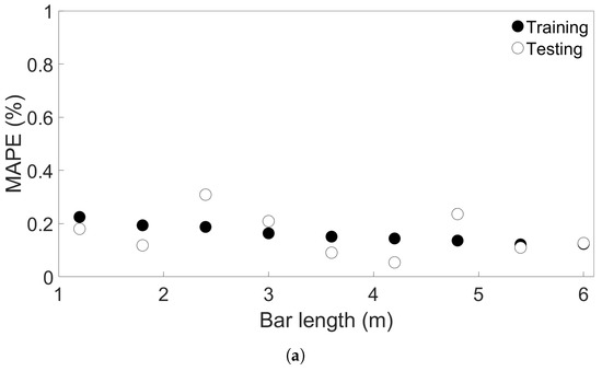 Here, M is the MAPE, n the sample size, the ith predicted value, and the corresponding true value. Four groups of FE simulations were considered: one consisted of one-layer bars of varying lengths; one of four-layer bars of varying lengths; one with bars of length 0.96 m with different numbers of layers; and one with four-layer bars of length 0.96 m with different scanning speeds. An illustration of the four groups and how the FE simulations in each group differ is shown in Figure 3. From here, we will refer to them as Groups 1 through 4. The data were rescaled between 0 and 1 before training, based on the highest value observed in each group of the FE simulations, so that the data for each model trained on FE simulations in the same group were rescaled the same way. Data from one node in the center of the bottom layer were also excluded from the training dataset; the data from this node were instead used to test model prediction on sequential data from a single node. To begin with, the viability of the MLP models was tested by using trained models to predict the temperature evolution of the one-layer systems in Group 1. Figure 4a shows the training and testing MAPEs for MLP models applied to each of the nine Group 1 systems. An overview of the systems and their bar lengths is shown in Table 2; while the testing MAPE shows more variation than the training MAPE, it is lower than 0.4% in all cases and still close to the training MAPE. This suggests that overfitting is not a significant issue in the one-layer case.