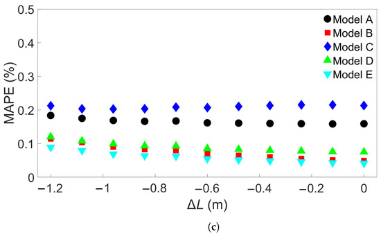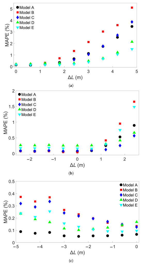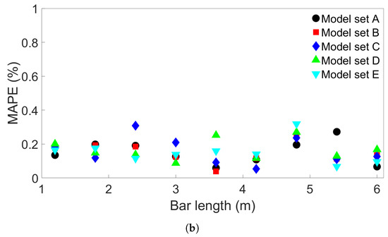 The models trained on the other Group 1 systems do not show as high an error. Figure 6b shows that for models trained on System 5, the largest positive length difference of 2.4 m results in a low MAPE, at less than 2% for all Models A through E. The average MAPE increases from 0.12% for baseline testing to 1.05% for testing on System 9. The difference between the baseline case and testing on System 1 is very small, with testing on System 1 giving an average MAPE of 0.14%. Models trained on System 9, the system with the longest bar length, show a similar small increase in error as length difference increases. The results are shown in Figure 6c; the average MAPE goes from 0.12% with a standard deviation of 0.04% in the baseline case to 0.25% with a standard deviation of 0.11% when tested on System 1.