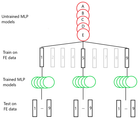 An illustration of the transferability testing process. Groups of five MLP models are trained on data from selected FE simulations, and the trained models are subsequently used to test data from each of the simulations.