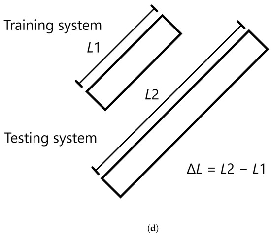 The testing MAPE for MLP models applied to all nine Group 1 systems. (a) Models were trained on System 1. (b) Models were trained on System 5. (c) Models were trained on System 9. Models A through E differ in initial seed before training. (d) Definition of the difference in length, L.