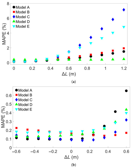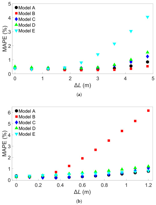 One potential cause of the particularly high error observed in Section 3.3 is overfitting; while the baseline tests in Section 2.3 do not show a high error, it is possible that a small degree of overfitting in a model could become more prominent when the model is used to test data from substantially different FE simulations. Thus far, the batch size was set to 64. One way to reduce overfitting is to increase the batch size, which lowers the amount of times the MLP weights are updated during training. To explore the effect of batch size on the models used thus far, additional MLP models were created with the same properties as previously described, except for batch size and number of epochs. The batch size for these additional models was set to 640, ten times larger than the batch size of 64 used for the previous models. The number of epochs for the additional models was determined through preliminary testing. For the models trained on Group 1 systems, the number of epochs was kept at five, while for the models trained on other systems, it was increased to eight. Figure 16a shows the MAPE when batch-size-640 models trained on System 1 from Group 1 are tested on the other Group 1 systems, similar to Figure 6a. Figure 16b shows the MAPE for batch-size-640 models trained on System 1 from Group 2 and tested on other Group 2 systems, as in Figure 7a. Comparing each of the figures, the batch-size-640 models appear to perform better overall than the previously examined batch-size-64 models. It is also clear from the figures that there is no guarantee that any given model which performs well at a given seed and low batch size will give good performance with a higher batch size, as seen with the two Model Es trained on Group 1, Model 1, in Figure 6a and Figure 16a. Additional tests were performed with 15 additional batch-size-640 models with different random seeds for both the Group 1 and the Group 2 systems. The models were trained on System 1 from Group 1 or Group 2 and then used to test System 9 from Group 1 or System 11 from Group 2, respectively. The resulting MAPEs are shown in the Supplementary Material, the Group 1 results in Table S8 and the Group 4 results in Table S9. From these tables, we see that the performances of Model E in Figure 16a and Model B in Figure 16b, while particularly high, are not outliers. In the Group 1 batch-size-640 case, including results from the additional models led to an average MAPE of 1.83% with standard deviation 1.11% for testing on System 9. For the Group 2 batch-size-640 case, an average of 1.51% with standard deviation 1.54% was found for testing on System 11. For both sets, this is an improvement over the average errors obtained using batch size 64. In the case of the largest length differences, for the models trained on System 1 from Group 1, there were five models with a MAPE of less than 1%, while for models trained on System 1 from Group 2 there were nine, though there were also several models with a MAPE just above 1%.