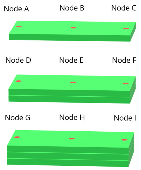 To investigate the error observed in Section 3.3 further, we performed additional single-node temperature predictions for System 13 from Group 4. Nine different nodes from System 13 were used, labelled Nodes A through I, in the positions illustrated in Figure 8. Nodes A and C were positioned 0.025 m from each end of the bar, and Node B was positioned in the center, all in the first layer. Node B’s position was the same as the single nodes examined in the previous sections. Nodes D through F and G through I were positioned at those same horizontal locations, but in layers 2 and 3, respectively. Models A and C from Figure 13b were used to test the single-node data to compare the poorly performing Model C with a model that performs better. The results for testing on data from Node B are shown in Figure 15a, while the results for Node A and Nodes C through I are shown in Figures S4 through S11 in the Supplementary Material. From the figure, we observe that the temperature evolution predicted by Model A shows the same trend as Model C but with a smaller error between the first two temperature peaks. In both cases, the error disappears after the second peak. In Figures S4–S11, showing the results from prediction on Nodes A and C through I, this error is present for all predictions between the first and second peaks. For the nodes near the bar edges, there is also a prediction error between the second and third peaks. This error is present regardless of whether the node is in the first or second layer. We see that the prediction during the first peak varies between overshooting and undershooting the actual temperature.