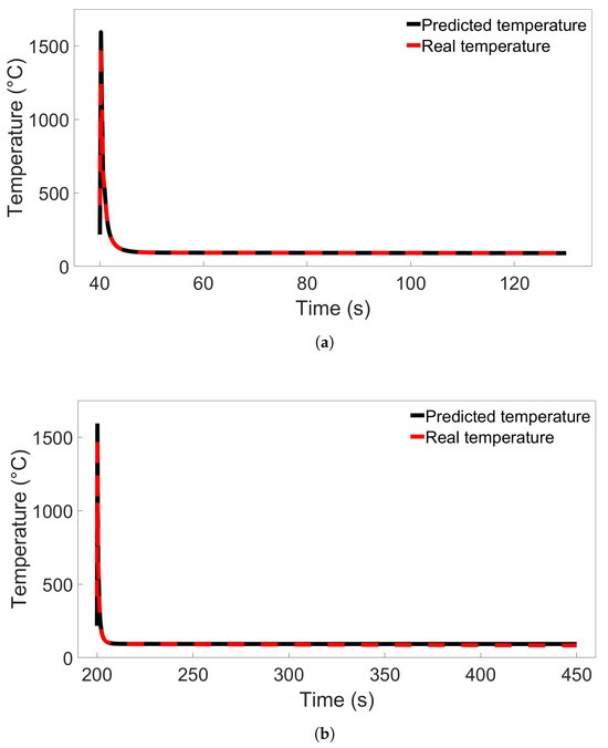 (a) The temperature evolution over time for Node B in System 13 from Group 4 as predicted by Model C from Figure 13b compared with the real temperature evolution. (b) The temperature evolution over time for Node B in System 11 from Group 2 as predicted by Model C from Figure 7a compared with the real temperature evolution.