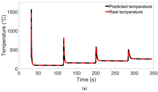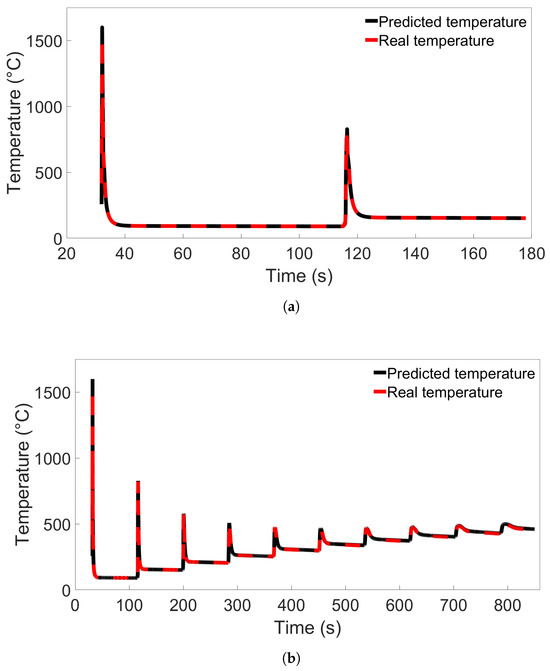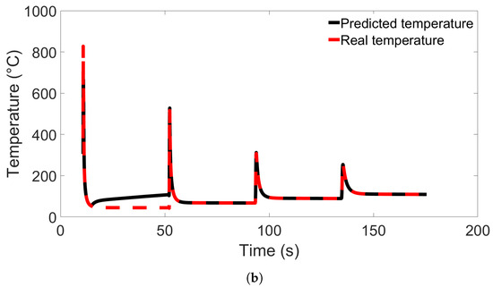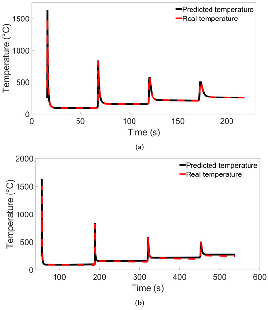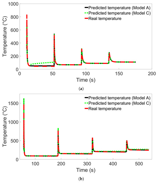 Single-node prediction was also performed. Model A from Figure 11a was used to predict temperature evolution in a single node from System 1 and System 9 from Group 3, located in the Node B position as shown in Figure 8. The resulting temperature evolutions are compared with the real temperatures in Figure 12. The error in predicted temperature when the model is tested on the 10-layer System 9 is lower than was observed in Figure 10b, but a slight error is again observed during the later parts of the deposition process.