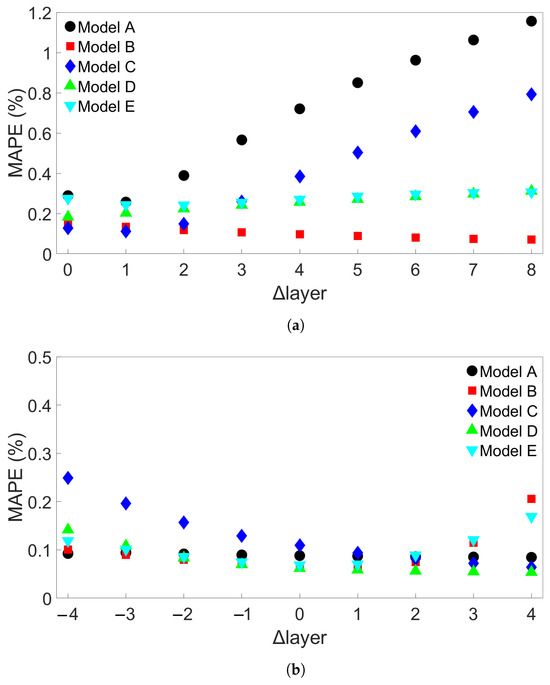The third group of systems investigated was Group 3, which consisted of multilayer bars with different numbers of layers, ranging from 2 to 10. For the Group 3 systems, the length of each deposited layer was kept constant at 0.96 m. A total of nine such systems were simulated, including one which was also part of Group 2. A list of the Group 3 systems is shown in Table 4. Figure 11a shows the results from cross-system testing using models trained on System 1, Figure 11b for models trained on System 5, and Figure 11c for System 9. Similar trends to the ones observed in Figure 6 and Figure 7 can also be seen here, though the increase in MAPE is much smaller, reaching a maximum value of around 1.2% when one of the models trained on System 1 is used to test System 9. Two of the models show limited error growth, while Model B shows a slightly decreasing error. A total of 15 additional models were trained on System 1 and tested on System 9 to further examine model performance. The results are shown in Table S6 in the Supplementary Material. With these results included, the average MAPE for prediction of System 9 is 0.66%, with a maximum value of 4.02%. This is better than the average MAPEs that were found for prediction of System 9 from Group 1 using models trained on System 1 from Group 1 and for prediction of System 11 from Group 2 using models trained on System 1 from Group 2. Figure 11b shows that Models B and E perform worse as the number of layers of the test system increases, while the other models do not. In Figure 11c, we observe a marginal increase in error as the difference in number of layers increases. For both Figure 11b,c, the MAPE remains very small at less than 0.5%.