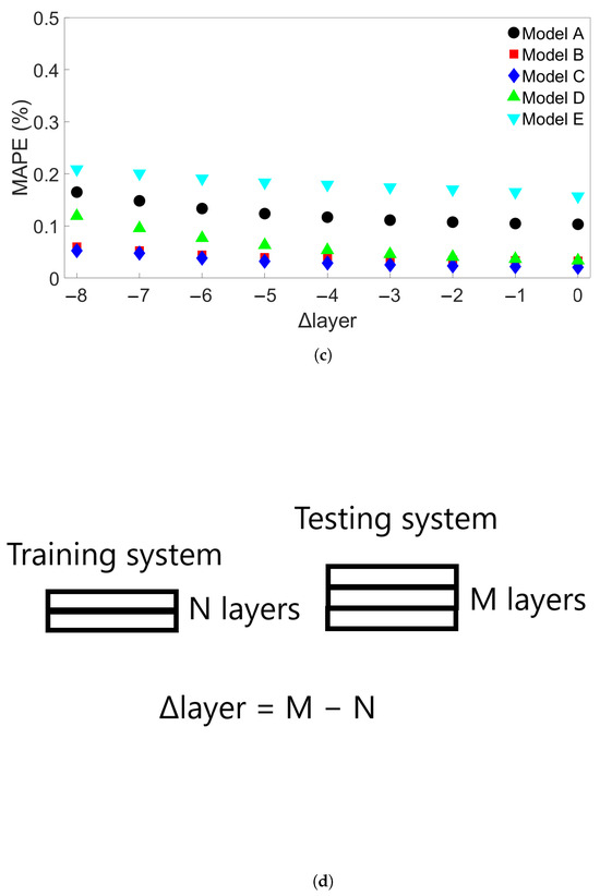 The testing MAPEs for MLP models applied to each of the nine Group 3 systems. (a) Models were trained on System 1. (b) Models were trained on System 5. (c) Models were trained on System 9. Models A through E in each case differ only in the initial seed set before training. (d) Definition of the difference in number of layers, Δlayer.