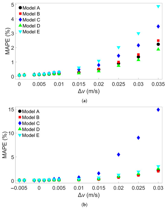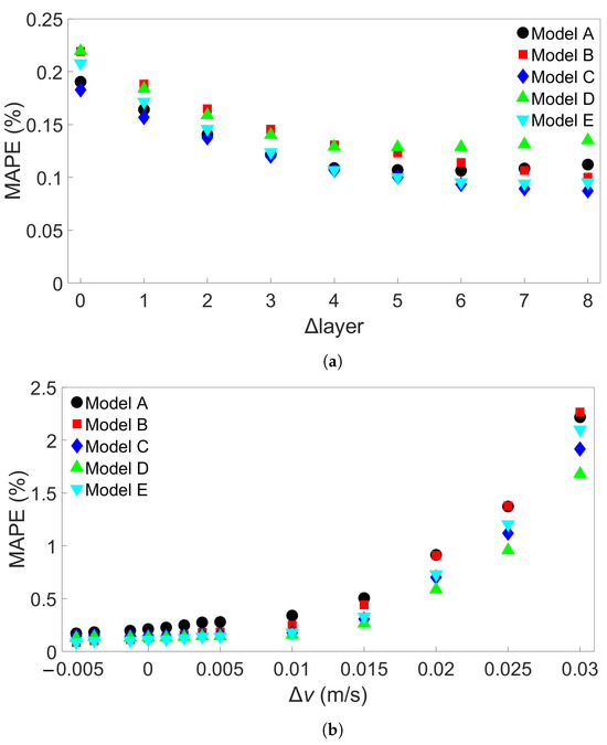 The last group of FE simulations considered was Group 4, which consisted of 13 four-layer bars with the same length of 0.96 m but with different scanning speeds. Table 5 shows the scanning speed for each of the Group 4 systems. Figure 13a shows the MAPE for cross-system testing with Group 4 systems when models are trained on System 1, Figure 13b the MAPE for models trained on System 4, and Figure 13c the MAPE for models trained on System 13. Here, we observe a greater increase in MAPE when a model trained on a system with a slower scanning speed is tested on a system with a faster speed; the MAPE still remains good when tested on a system with a similar scanning speed. Figure 13a shows that the models all give a MAPE of less than 1% at a difference in scanning speed of 0.015 m/s. When used to test System 13, which has a 0.035 m/s faster scanning speed than the training system, the errors ranges from 2 to 5%. In Figure 13b, however, it can be seen that one of the models has a radically different error growth than the others, namely, Model C. The other models all have approximately the same error growth, giving a MAPE of between 2 and 3% when testing on System 13. Figure 13c shows a general decrease in error up to a difference of about 0.02 m/s; further differences lead to a slight increase in error, though the error still remains lower than 0.5%. In order to see if this trend would hold, 15 additional models with different initial random seeds were trained on System 4 and tested on System 13. The MAPEs are shown in Table S7 in the Supplementary Material. None of these additional models gave a higher MAPE than Model E’s error of 3.03%, leaving Model C’s MAPE of almost 15% a clear outlier. The average MAPE for all 20 models is 2.88%.