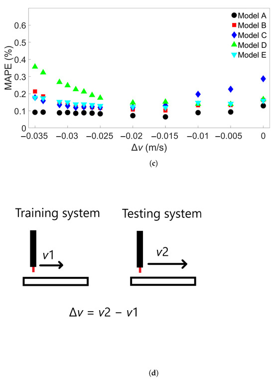 The MAPEs for MLP models trained on (a) System 1, (b) System 4, and (c) System 13 from Group 4 and tested on each system in Group 4. Models A through E differ only in initial seed before training. (d) Definition of the difference in scanning speed, v.