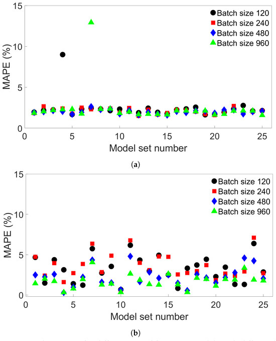The MAPEs for different sets of four MLP models with different batch sizes. (a) The models were trained on System 4 from Group 4 and tested on System 13 from Group 4. (b) The models were trained on System 1 from Group 1 and tested on System 9 from Group 1.