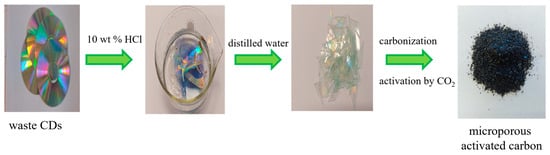 - Choma, J.; Marszewski, M.; Osuchowski, L.; Jagiello, J.; Dziura, A.; Jaroniec, M. Adsorption properties of activated carbons prepared from waste CDs and DVDs. ACS Sustain. Chem. Eng. 2015, 3, 733–742. [Google Scholar] [CrossRef]