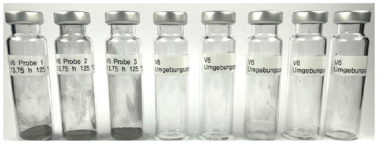 The water content of the undried powder that was also measured at the beginning of the test series, and was 51.4 ppm. At the end of the test series, its water content was 51.1 ppm, showing no significant difference. The water content of test 6 was 14.5 ppm. After one week of storage in the glass sample bottles, the water content was 15.8 ppm. This change is significantly smaller than the range of the individual measured values. Nevertheless, we noted if a sample was not measured until the following day.