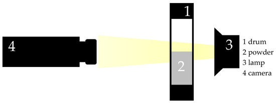 One primary focus of the investigation was to improve the flowability of the analyzed fine metal powder. A suitable criterion must therefore be defined. Flowability is not a direct measurement, but rather an indication of how easily a powder can flow freely. Typically, the flow rate through a Hall flow meter according to DIN EN ISO 4490 [36] is used for this purpose. However, this method is unsuitable due to the small particle size distribution and the correspondingly poor flow properties. Therefore, a GranuTools Granudrum using the rotating drum method was used [37], which is better-suited to the MBJ process. The principle of this method is illustrated in Figure 2. A transparent drum (1) was filled halfway with powder (2) and rotated along its axis. This creates an angle of repose for the powder. The drum was backlit to enhance contrast for the camera (3), which captured individual images of the powder during the measurement process (see Figure 2).