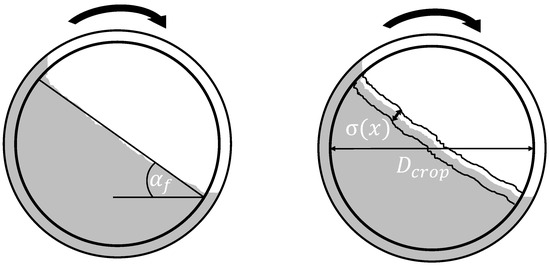 One drawback of the method is the challenge of comparability due to the multitude of different measurable parameters [37]. The dynamic angle of repose α f and cohesion index ( C I ) values were selected for this study (see Figure 3). The dynamic angle of repose describes the flow angle, as depicted in the left-hand side of the illustration at certain rotating speeds.