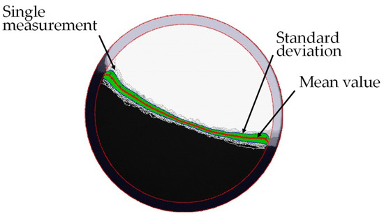 Eighty images were taken for each measurement. The direction of rotation of the drum was changed after 40 images. A total of three powder samples were also measured here, meaning that a total of 240 measured values can be averaged for the dynamic angle of repose αf. For the cohesion index CI, only two measured values were collected per measurement, one for each direction of rotation. The result was therefore averaged from six measured values. According to the manufacturer’s experience, the measurement accuracy of the method is 1.67%, which in this case corresponds to a range of 0.52–0.58°. The many measured values for the dynamic angle of repose are necessary here, as the angle was determined using an idealized straight line on the powder surface. This adjustment is difficult with a powder that generally has poor flowability (see Figure 4), as the powder surface has a curved shape.