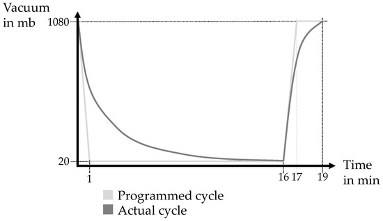 A vacuum-drying oven from Memmert VO49 was used for powder conditioning. For this, a fixed vacuum cycle was defined before the experiment was carried out, which was used for all experiments. As illustrated in Figure 5, the maximum vacuum is 20 mb, which can be drawn within 16 min. The pressure was released to ambient pressure after a further three minutes, so that the entire cycle took 19 min. This process was then repeated according to the drying time of the test.