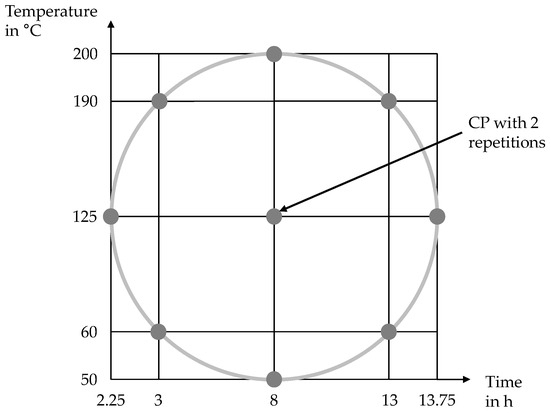 With these reference values, the range of the factor time was set to 2.25–13.75 h and the factor temperature to 50–200 °C. Furthermore, it is assumed that the drying relationship is not linear, which is why at least three factor levels were analyzed.
